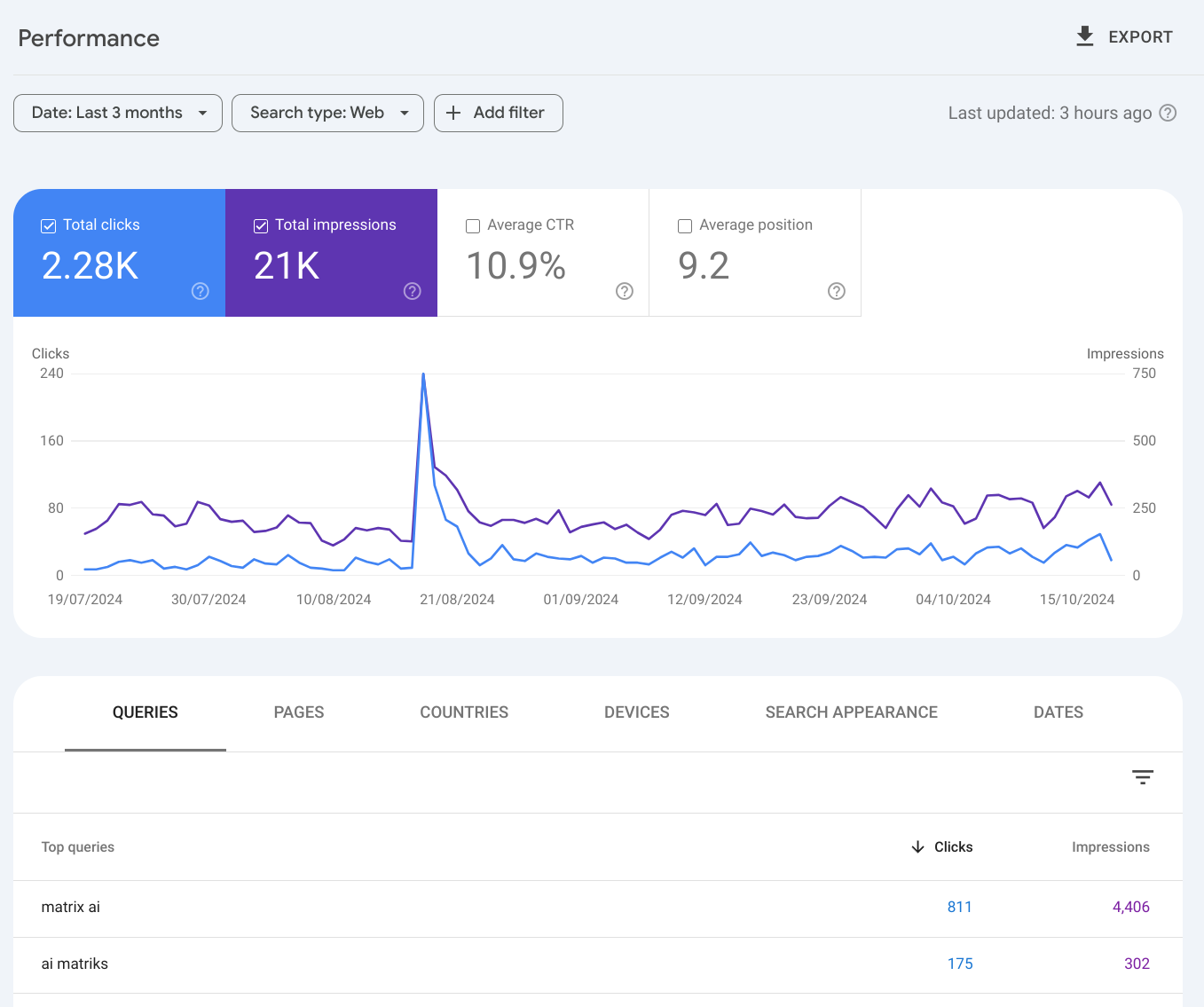 - matrix.ai - https://search.google.com/search-console/insights/u/1/?resource_id=sc-domain:matrix.ai
